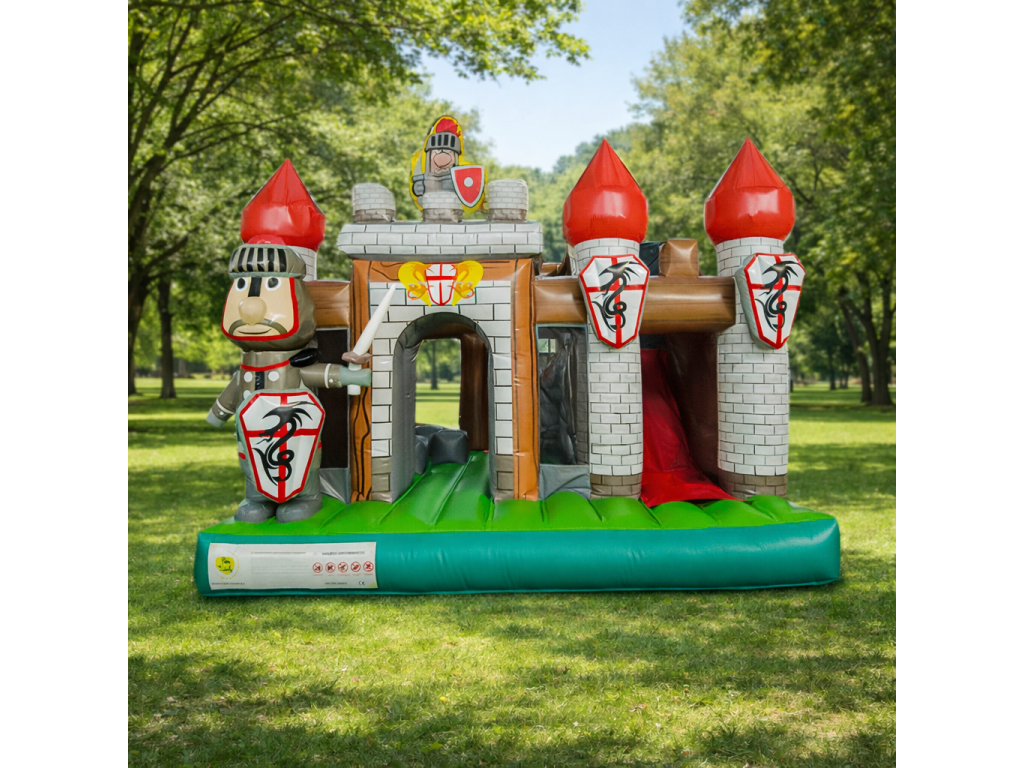Nafukovací hrad v štýle stredovekého hradu s rytiermi a šmykľavkou je ideálny pre detské oslavy, záhrady aj eventy. Výrazný dizajn a kombinácia skákania so šmykľavkou zaručia maximálnu zábavu.