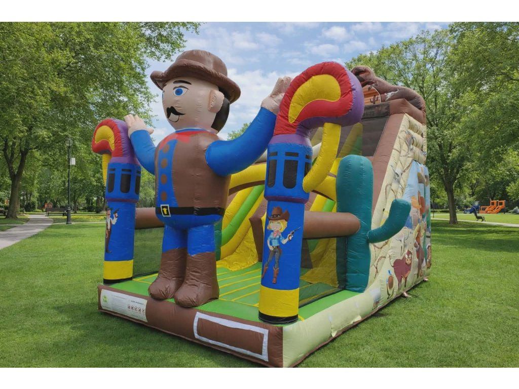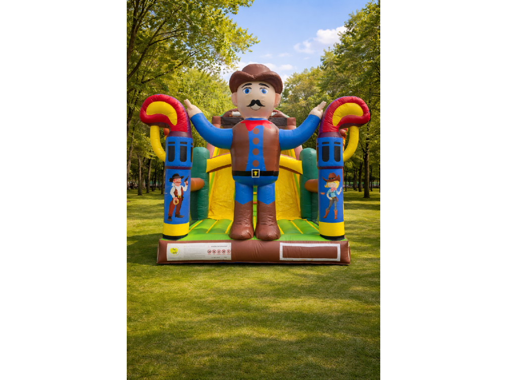 Nafukovacia šmykľavka Western Cowboy je atraktívna detská atrakcia v štýle divokého západu. Vďaka výraznému dizajnu a vysokej šmykľavke zaujme na každej akcii – ideálna na prenájom aj podnikanie.