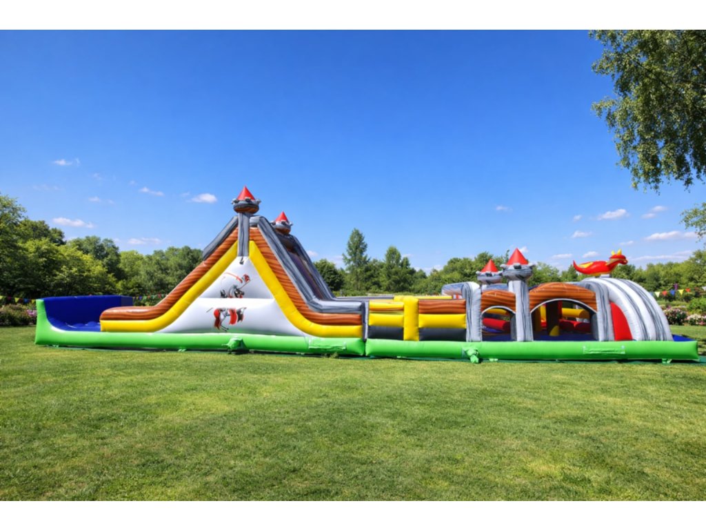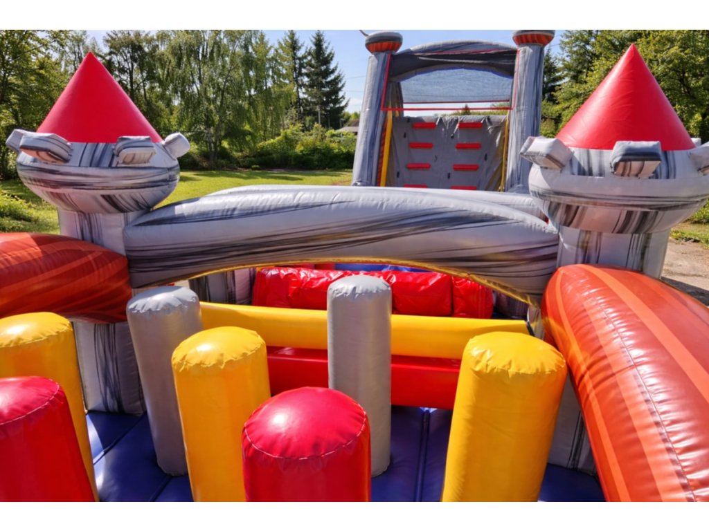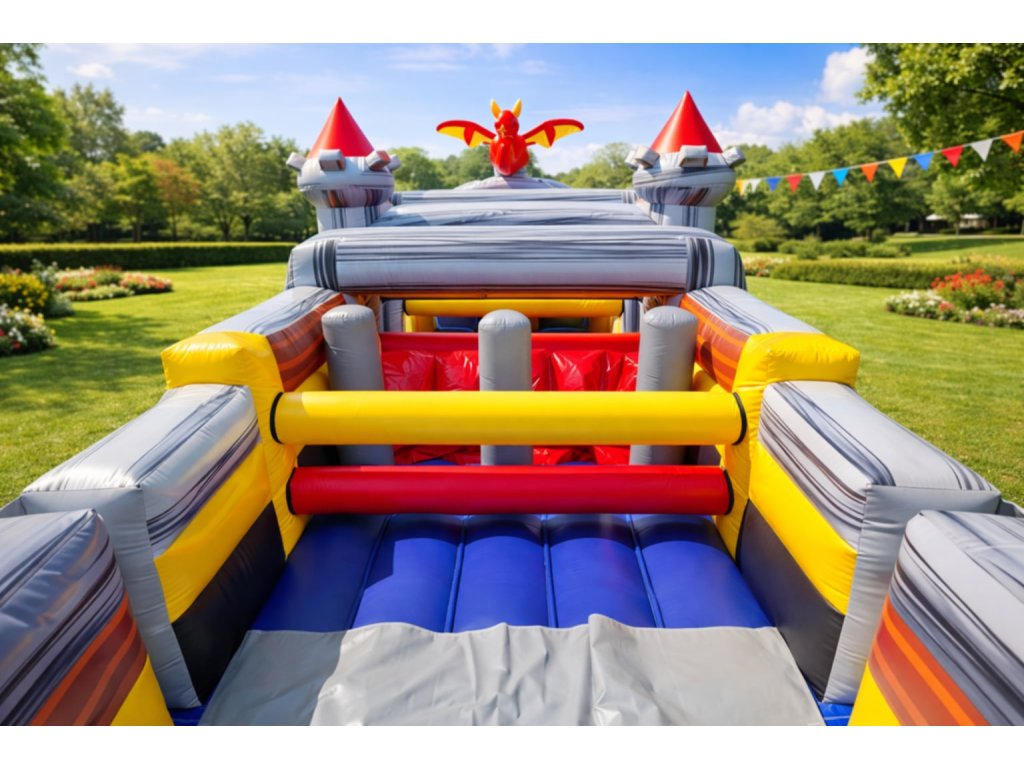Technické parametre Rozmery: 18 × 3 × 4,5 m Hmotnosť: 350 kg Typ: profesionálna nafukovacia prekážková dráha Použitie: prenájom / eventy / obce