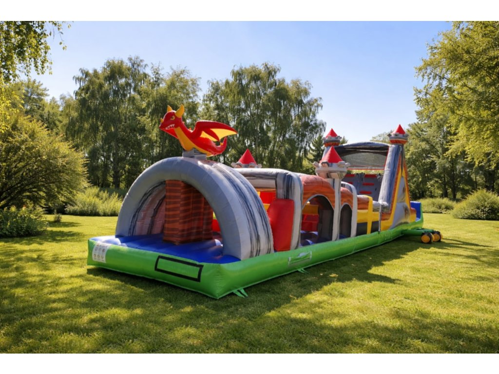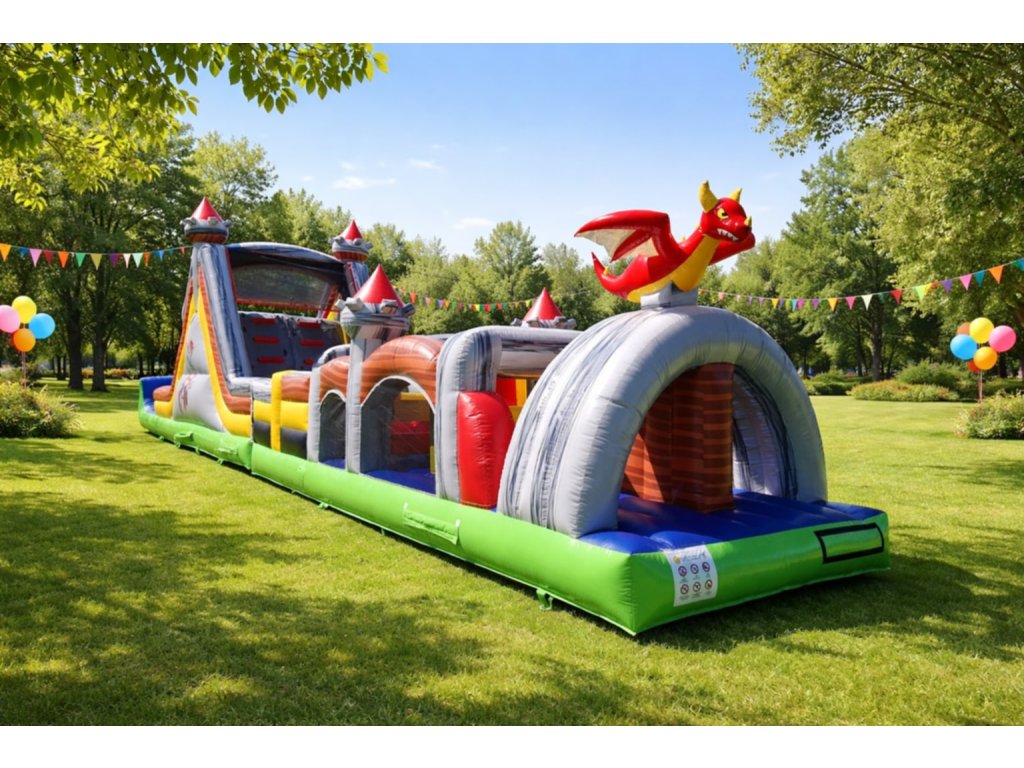 Dynamická nafukovacia prekážková dráha DRAK s dominantným šmykľavkovým kopcom a tunelovou časťou. Ideálna na eventy, obce, školy, firemné dni aj požičovne atrakcií. Vysoká kapacita detí, pevná konštrukcia a výrazný dizajn zaručia maximálny záujem.