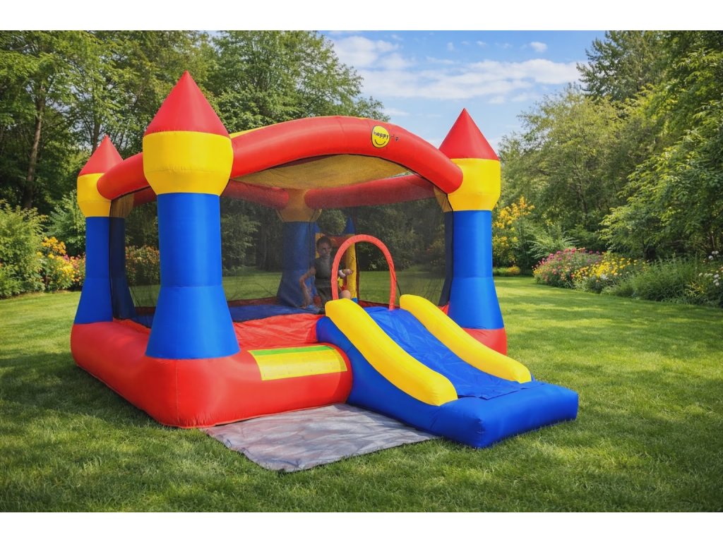 Vysoké rohové veže vytvárajú klasický dizajn skákacieho hradu. Sieťované bočné steny zabezpečujú bezpečnosť a zároveň umožňujú rodičom neustály dohľad.