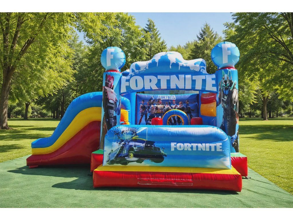 Skákací hrad 2v1 v obľúbenej grafike Fortnite spája skákaciu plochu a šmykľavku v jednej atrakcii. Výrazný dizajn pritiahne pozornosť na každej akcii – ideálny na prenájom, eventy, oslavy aj obecné podujatia. Atraktívny motív zvyšuje dopyt a návratnosť investície už počas prvej sezóny.