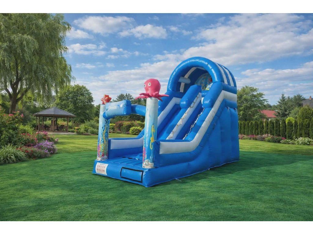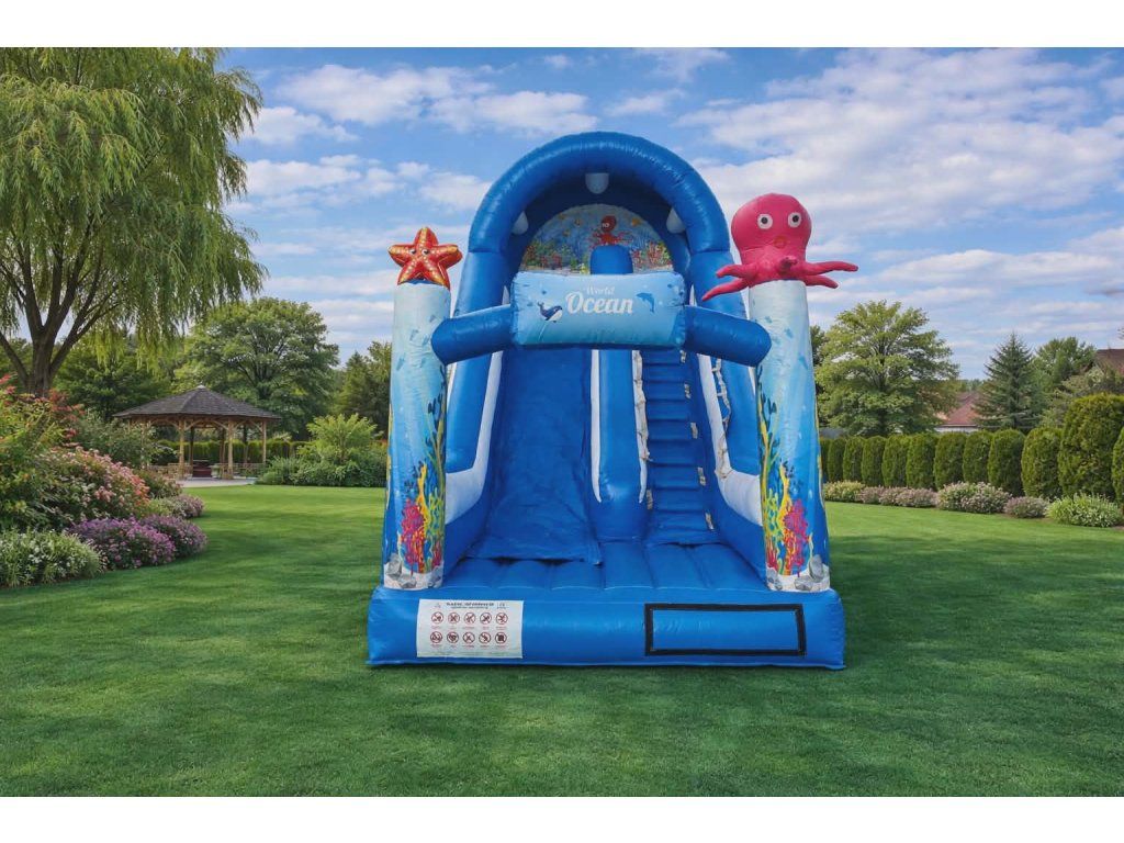 Tento nafukovací tobogán v morskom dizajne patrí medzi univerzálne modely, ktoré sa dobre prenajímajú počas celej sezóny.