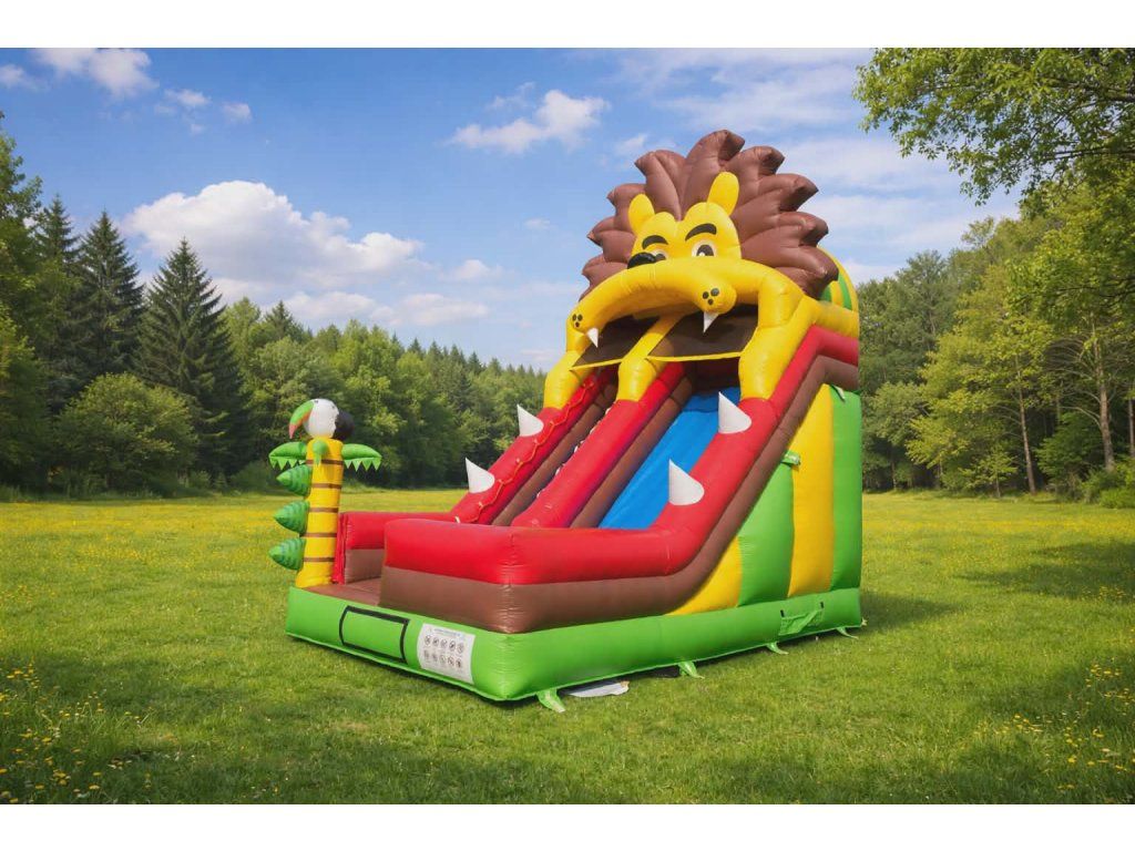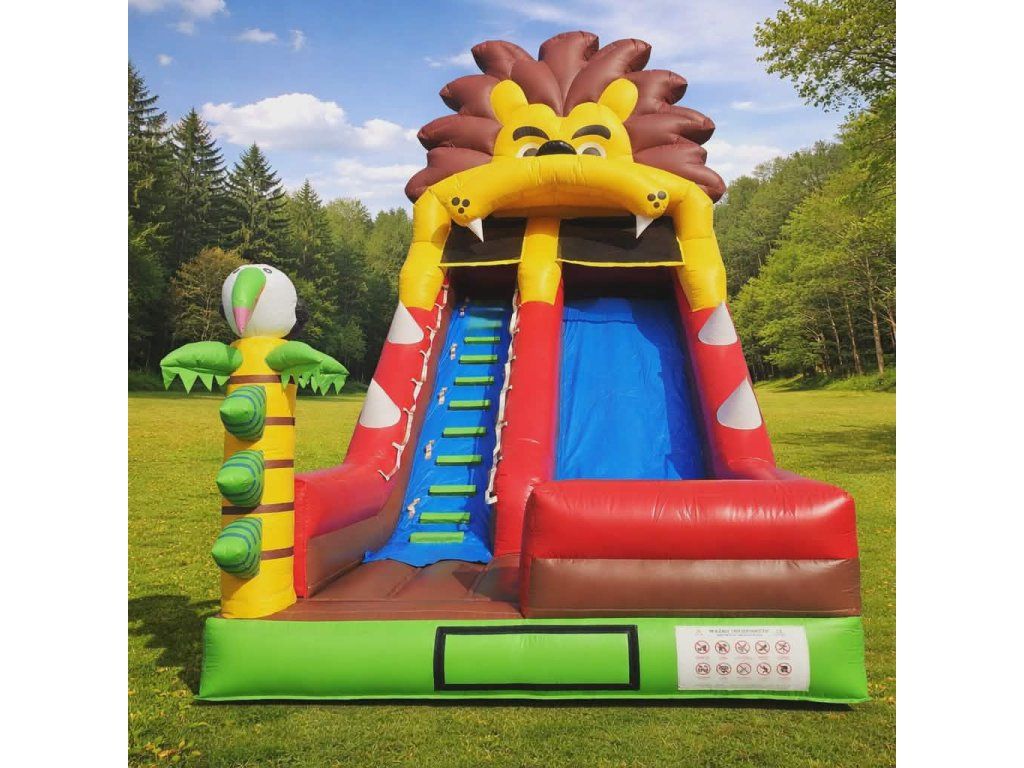– profesionálna atrakcia pre prenájom Krátky popis (do výpisu kategórie): Profesionálna nafukovacia šmykľavka v dizajne leva. Ideálna na podnikanie – vysoká, výrazná a extrémne atraktívna pre deti. Kompletný set pripravený na okamžité použitie.