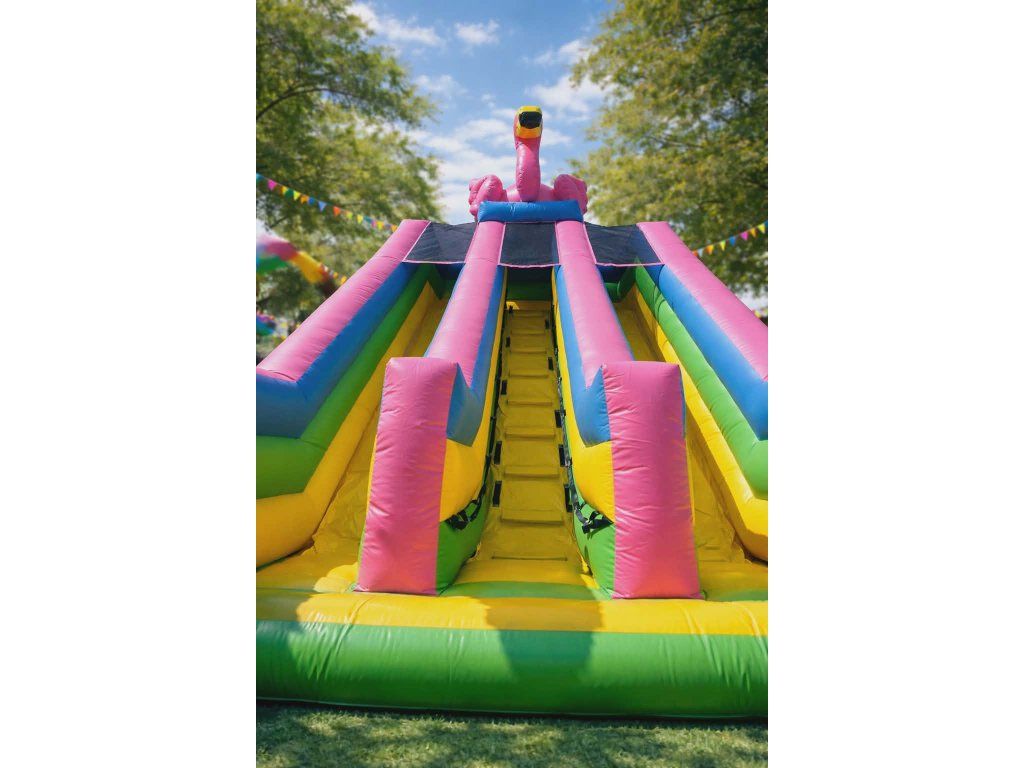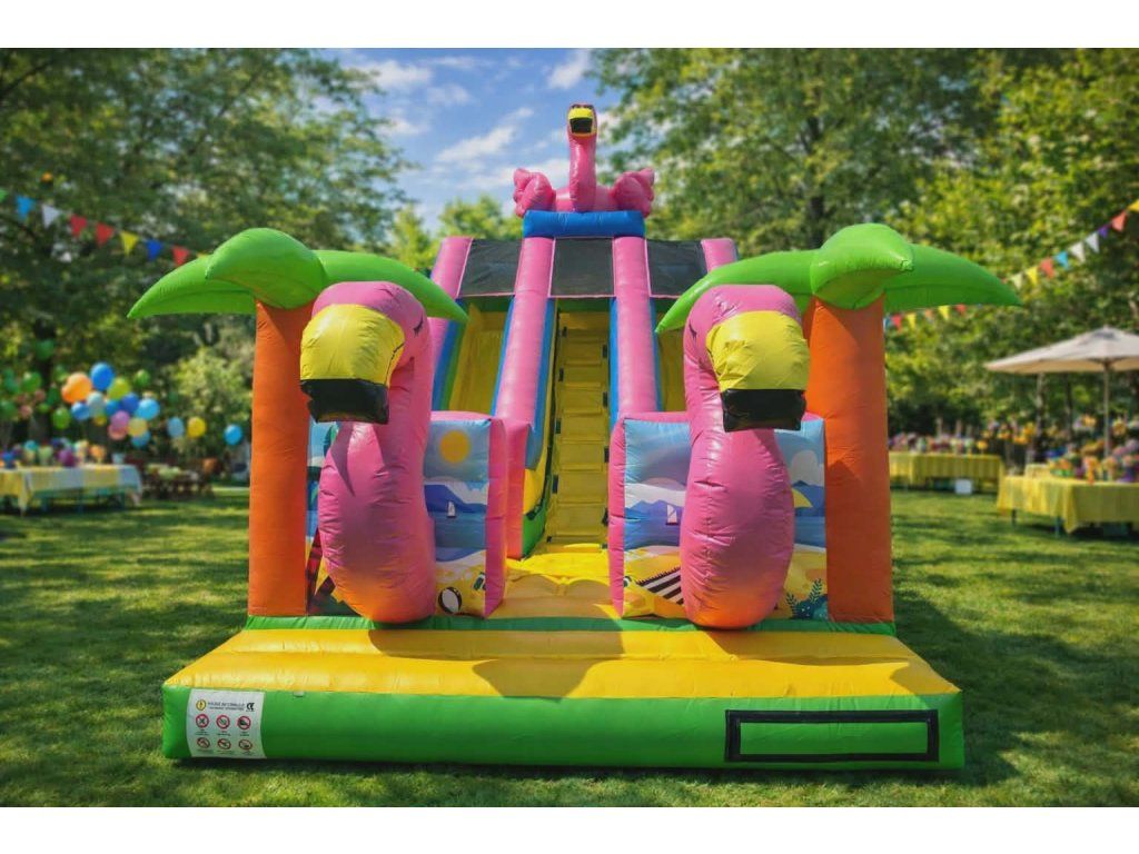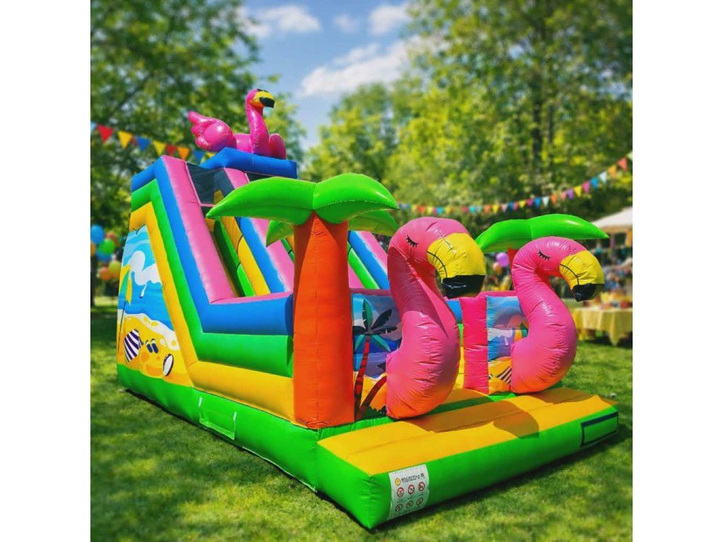 Nafukovacia šmykľavka Pelikán je veľká a atraktívna detská atrakcia s tropickým dizajnom. Kombinuje skákaciu plochu, výstup a vysokú šmykľavku, ktorá zaručí deťom veľa zábavy na oslavách, festivaloch alebo rodinných akciách. Vďaka výrazným farbám a motívu pláže okamžite pritiahne pozornosť a stane sa hlavnou atrakciou každého podujatia.