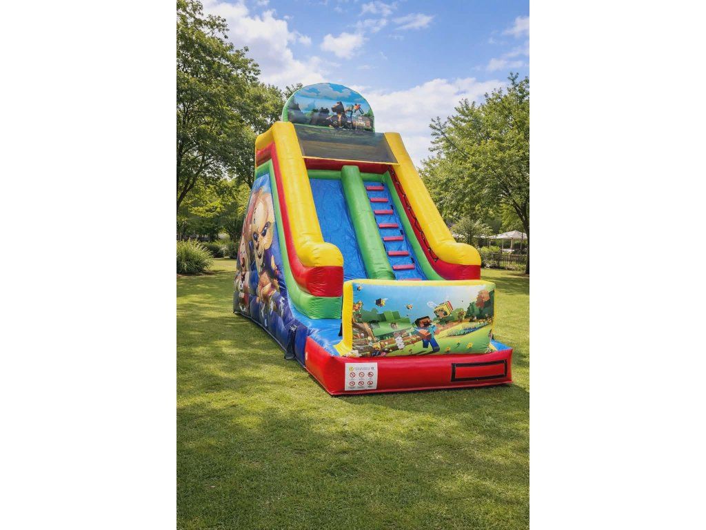 Skákacia šmykľavka Svet Minecrafta je atraktívna nafukovacia zábava pre deti, ktorá prenesie malých dobrodruhov do sveta obľúbenej pixelovej hry. Farebný dizajn, vysoká šmykľavka a bezpečné bočné steny zabezpečia množstvo zábavy na každej oslave, festivale či rodinnej akcii.